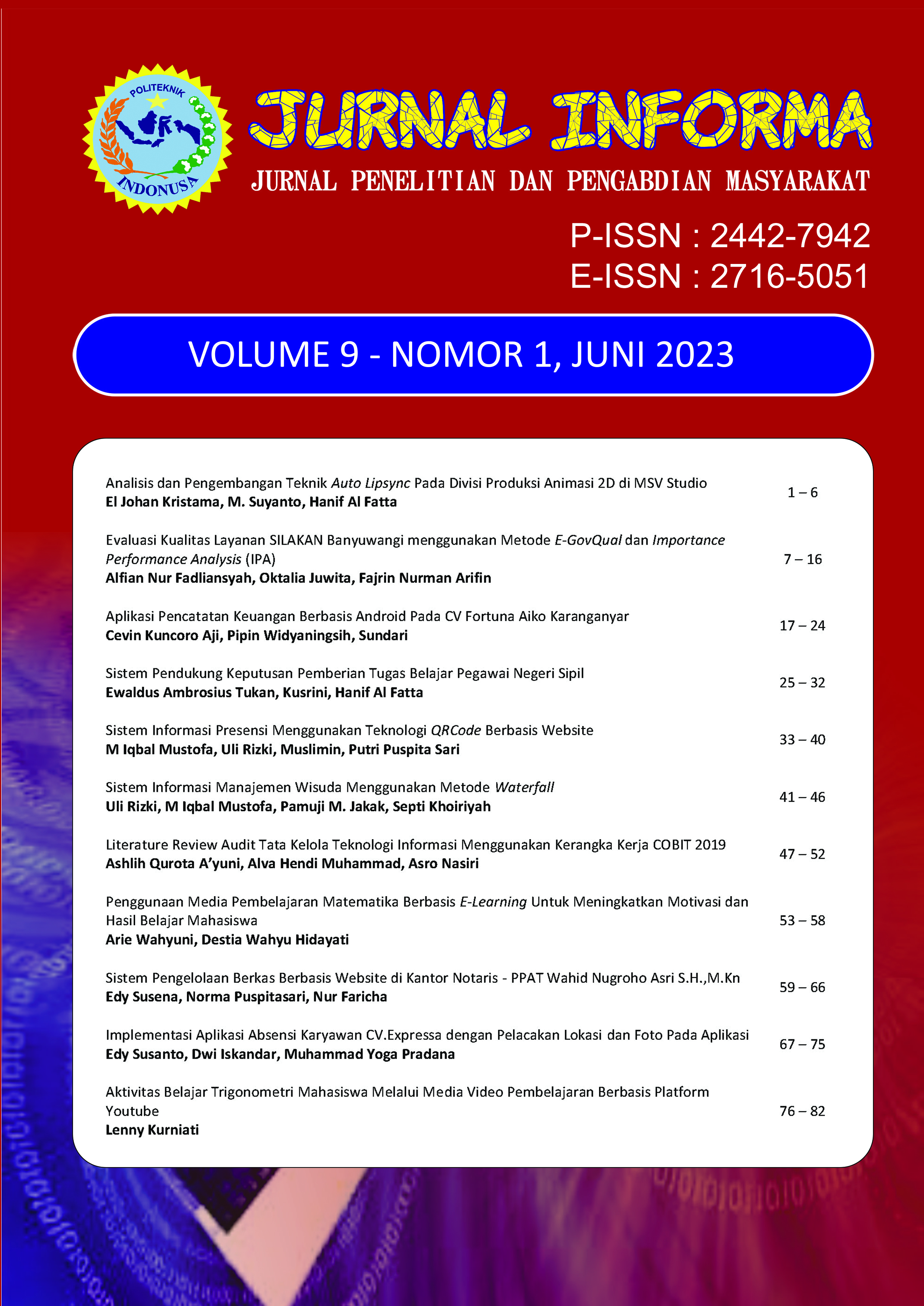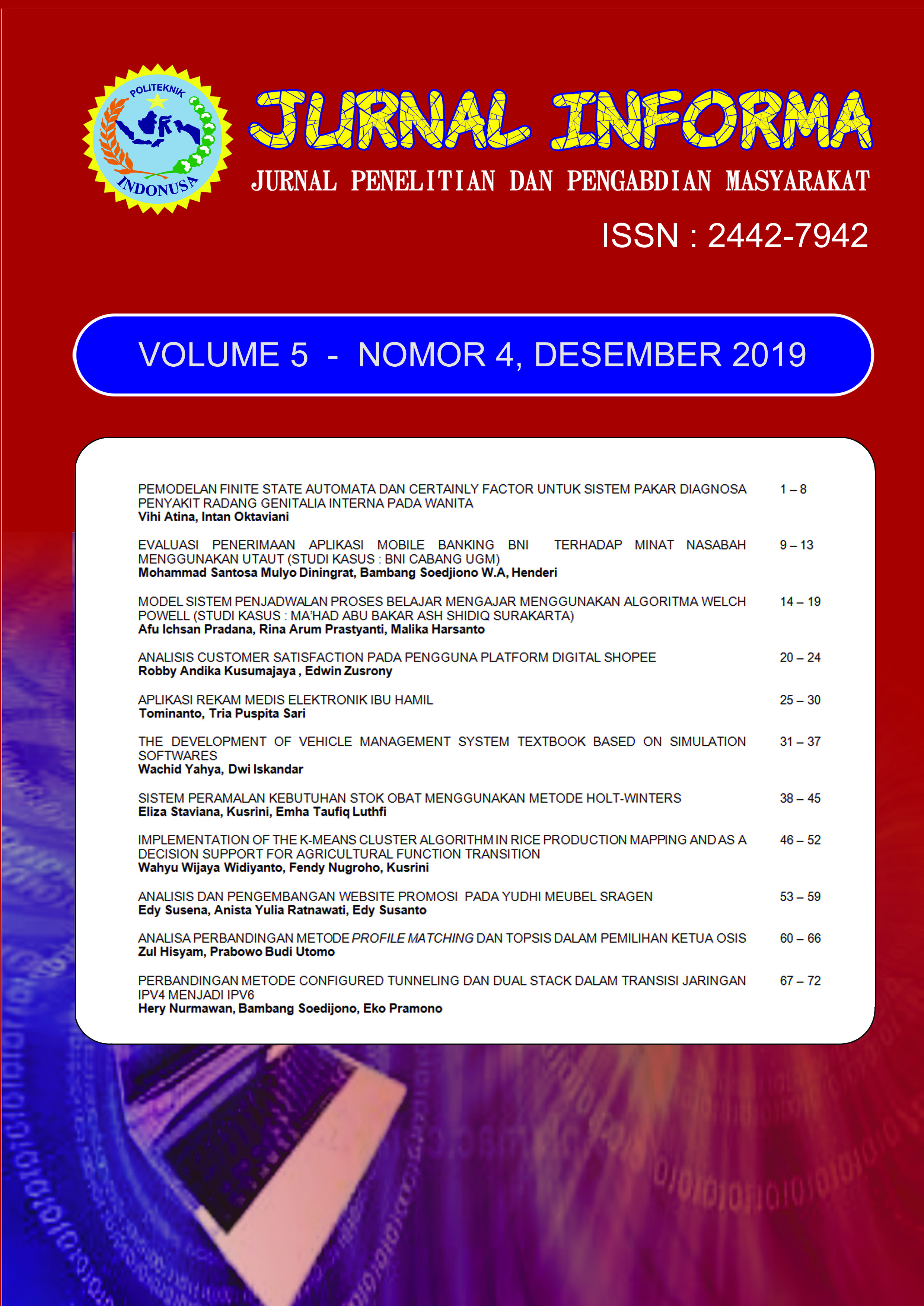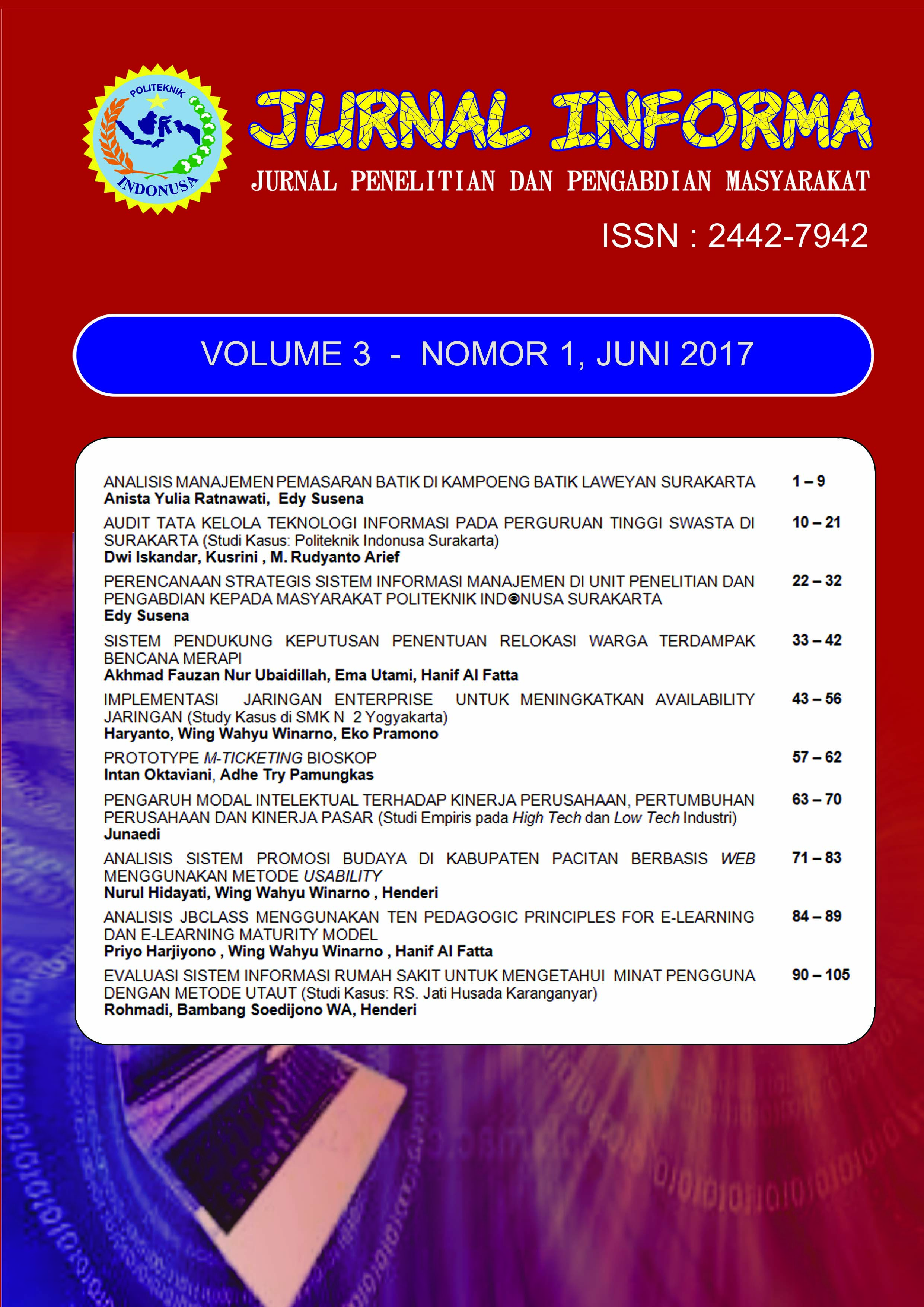 Dalam terbitan ini memuat 10 artikel hasil penelitian dan pengabdian masyarakat. Artikel pertama, Analisis Manajemen Pemasaran Batik Di Kampoeng Batik Laweyan Surakarta ditulis oleh Anista Yulia Ratnawati dan Edy Susena. Kemudian Dwi Iskandar, Kusrini , M. Rudyanto Arief Tentang Audit Tata Kelola Teknologi Informasi Pada Perguruan Tinggi Swasta Di Surakarta (Studi Kasus: Politeknik Indonusa Surakarta). Kemudian Edy Susena Tentang Perencanaan Strategis Sistem Informasi Manajemen Di Unit Penelitian Dan Pengabdian Kepada Masyarakat Politeknik Indonusa Surakarta. Sedangkan Akhmad Fauzan Nur Ubaidillah membahas Sistem Pendukung Keputusan Penentuan Relokasi Warga Terdampak Bencana Merapi. Selanjutnya Haryanto, Wing Wahyu Winarno, Eko Pramono membahas Implementasi Jaringan Enterprise Untuk Meningkatkan Availability Jaringan (Study Kasus di SMK N 2 Yogyakarta). Intan Oktaviani dan Adhe Try Pamungkas membahas Prototype M-Ticketing Bioskop. Berikutnya Pengaruh Modal Intelektual Terhadap Kinerja Perusahaan, Pertumbuhan Perusahaan Dan Kinerja Pasar (Studi Empiris pada High Tech dan Low Tech Industri) ditulis oleh Junaedi. Selanjutnya Analisis Sistem Promosi Budaya Di Kabupaten Pacitan Berbasis Web Menggunakan Metode Usability ditulis oleh Nurul Hidayati, Wing Wahyu Winarno, Henderi. Kemudian Analisis Jbclass Menggunakan Ten Pedagogic Principles For E-Learning Dan E-Learning Maturity Model ditulis Priyo Harjiyono, Wing Wahyu Winarno, Hanif Al Fatta. Sedangkan Evaluasi Sistem Informasi Rumah Sakit Untuk Mengetahui Minat Pengguna Dengan Metode Utaut (Studi Kasus: RS. Jati Husada Karanganyar) ditulis oleh Rohmadi, Bambang Soedijono WA, Henderi