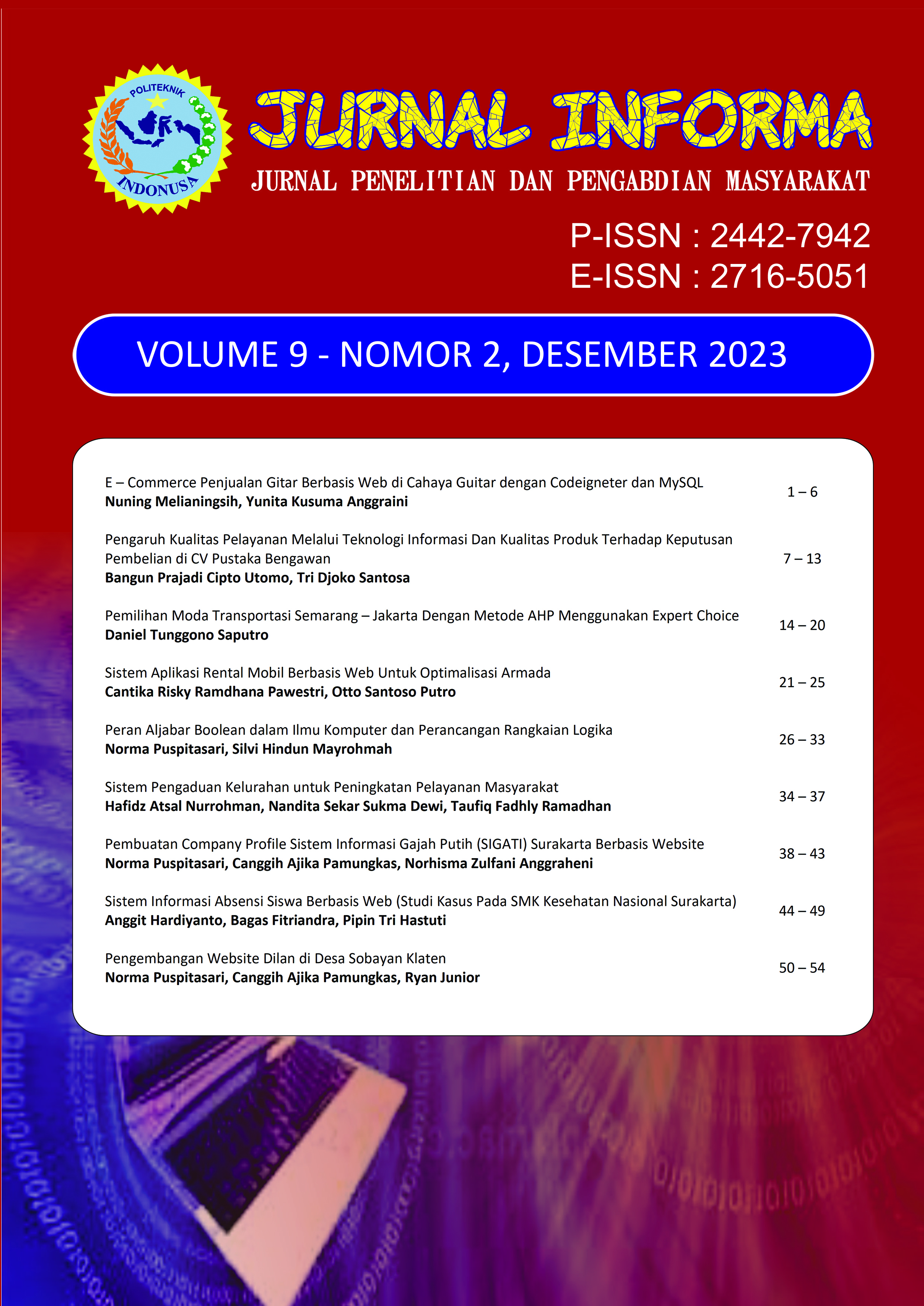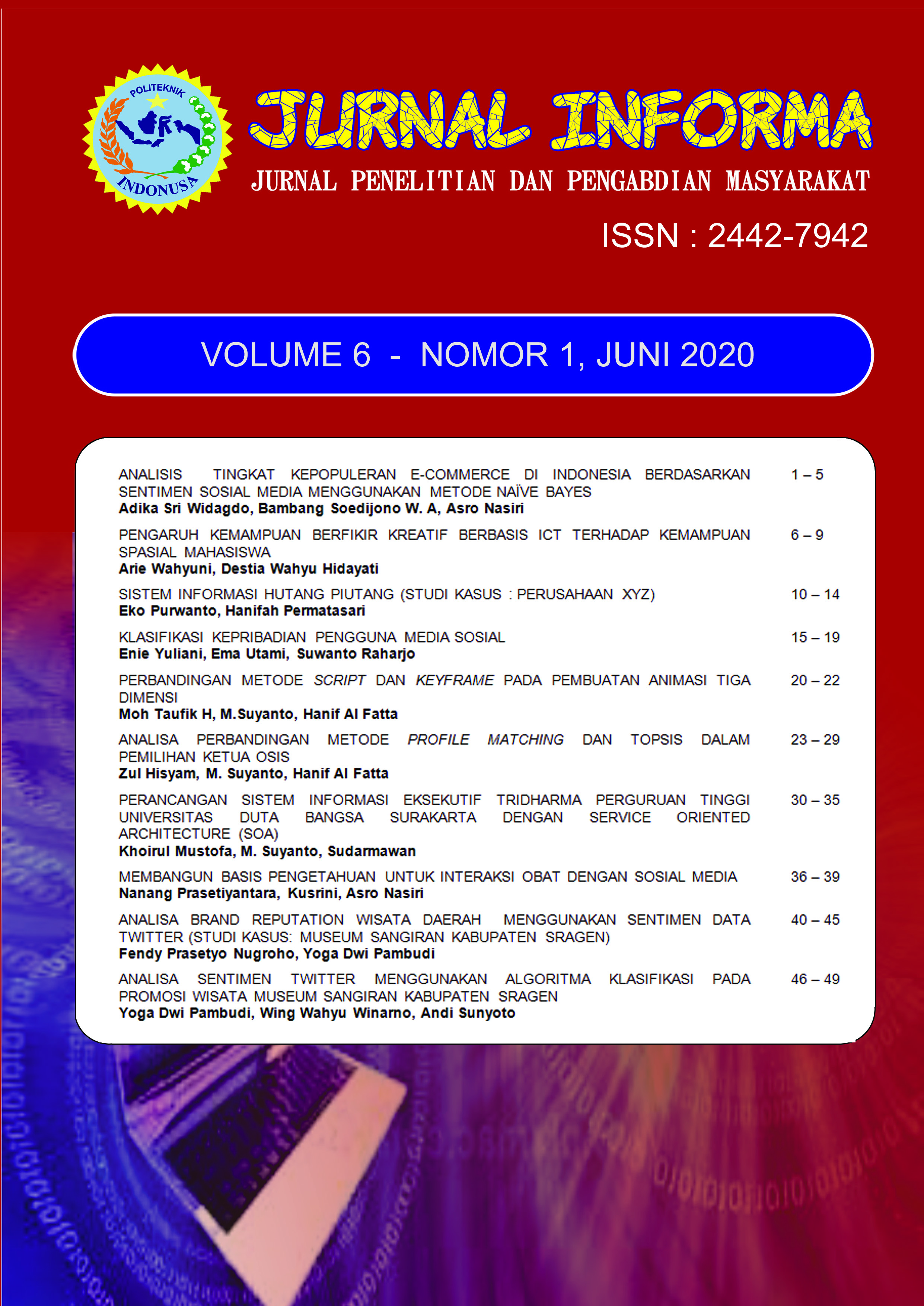 Jurnal INFORMA merupakan jurnal ilmiah bidang ilmu Komputer dan Informatika bersifat terbuka yang memuat tulisan hasil penelitian dan pengabdian kepada masyarakat. Jurnal ini diterbitkan oleh Program Studi D3 Sistem Informasi Politeknik Indonusa Surakarta. Jurnal terbit 2 kali dalam setahun, yakni pada bulan Juni dan Desember. Dalam terbitan ini memuat 7 artikel hasil penelitian.