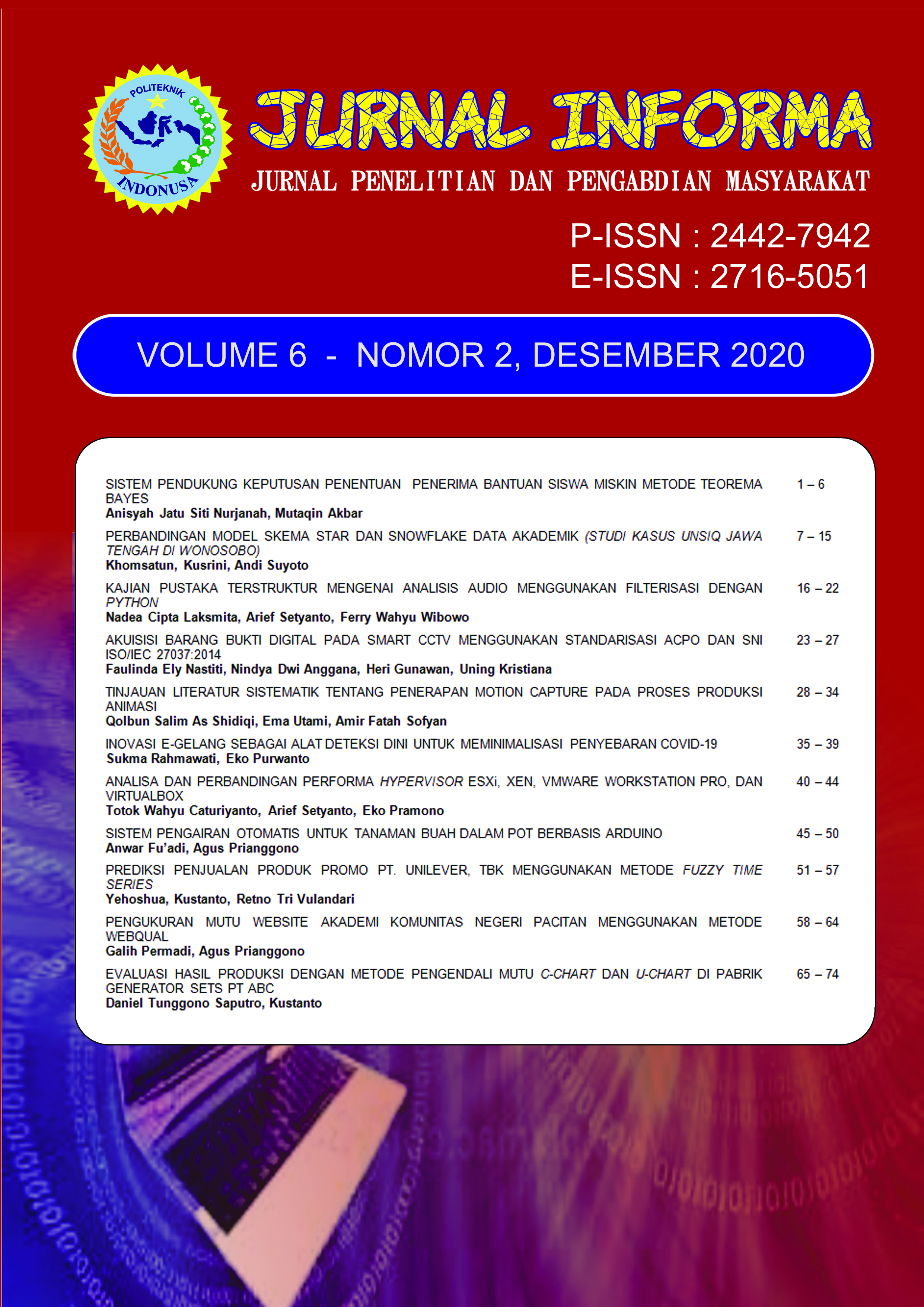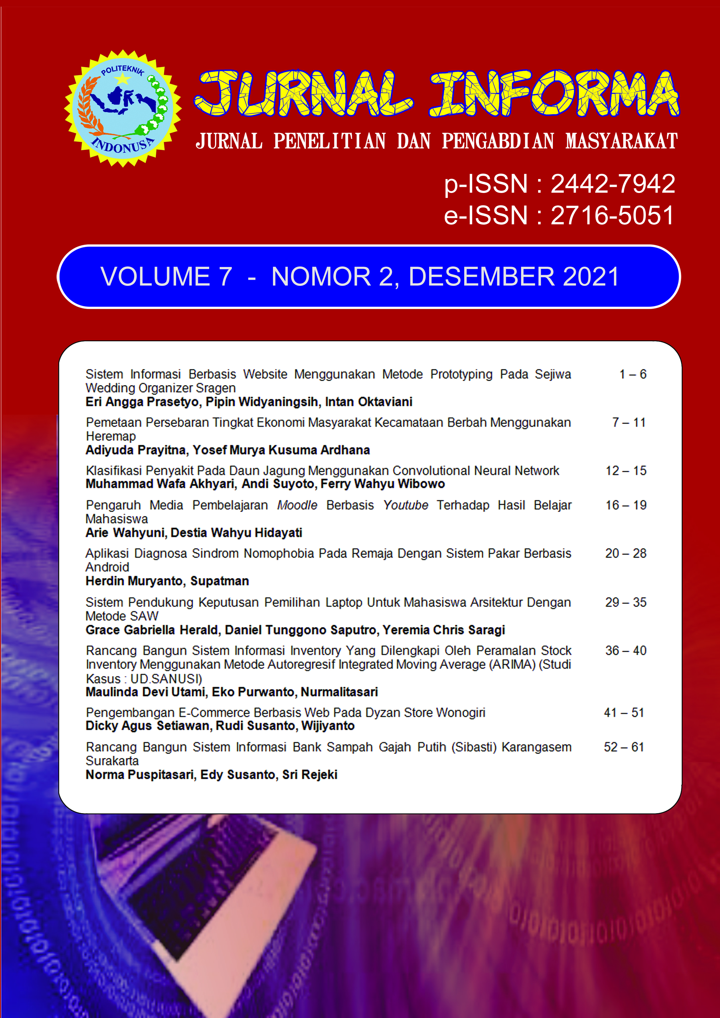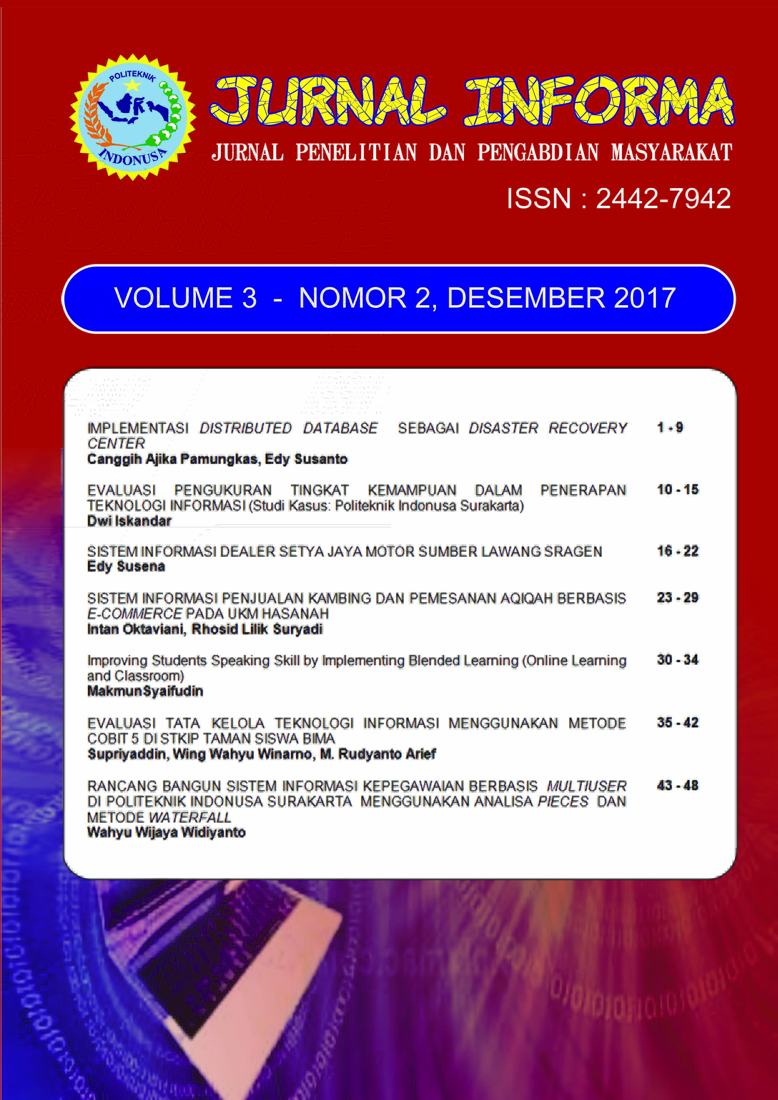Jurnal INFORMA merupakan jurnal ilmiah bidang ilmu Komputer dan Informatika bersifat terbuka yang memuat tulisan hasil penelitian. Jurnal ini diterbitkan oleh Program Studi D3 Manajemen Informatika Politeknik Indonusa Surakarta. Jurnal akan terbit 2 kali dalam setahun, yakni pada bulan Juni dan Desember.Dalam terbitan ini memuat 7 artikel hasil penelitian dan pengabdian masyarakat. Artikel pertama, Implementasi Distributed Database Sebagai Disaster Recovery Center ditulis oleh Canggih Ajika Pamungkas dan Edy Susanto. Artikel berikutnya Evaluasi Pengukuran Tingkat Kemampuan Dalam Penerapan Teknologi Informasi (Studi Kasus: Politeknik Indonusa Surakarta) ditulis oleh Dwi Iskandar. Artikel selanjutanya berjudul Sistem Informasi Dealer Setya Jaya Motor Sumber Lawang Sragen ditulis oleh Edy Susena. Berikutnya Sistem Informasi Penjualan Kambing Dan Pemesanan Aqiqah Berbasis E-Commerce Pada Ukm Hasanah ditulis oleh Intan Oktaviani dan Rhosid Lilik Suryadi. Kemudian artikel dengan judul Improving Students Speaking Skill by Implementing Blended Learning (Online Learning and Classroom) ditulis oleh MakmunSyaifudin. Selanjutnya Evaluasi Tata Kelola Teknologi Informasi Menggunakan Metode Cobit 5 Di Stkip Taman Siswa Bima ditulis oleh Supriyaddin, Wing Wahyu Winarno, M. Rudyanto Arief. Artikel terakhir ditulis oleh Wahyu Wijaya Widiyanto dengan judul Rancang Bangun Sistem Informasi Kepegawaian Berbasis Multiuser Di Politeknik Indonusa Surakarta Menggunakan Analisa Pieces Dan Metode Waterfall