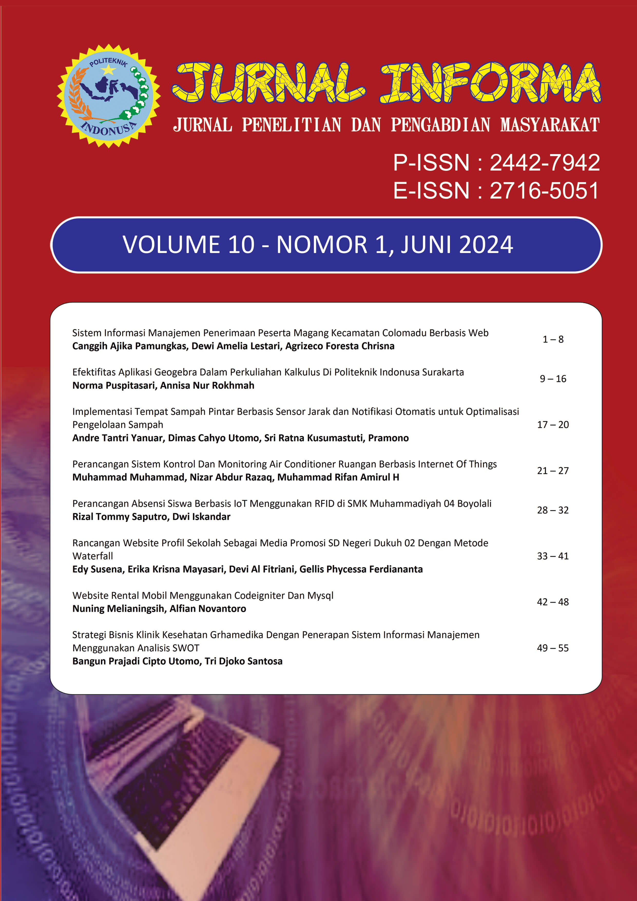 Jurnal INFORMA merupakan jurnal ilmiah bidang ilmu Komputer dan Informatika bersifat terbuka yang memuat tulisan hasil penelitian dan pengabdian kepada masyarakat. Jurnal ini diterbitkan oleh Program Studi D3 Manajemen Informatika Politeknik Indonusa Surakarta. Jurnal terbit 2 kali dalam setahun, yakni pada bulan Juni dan Desember.