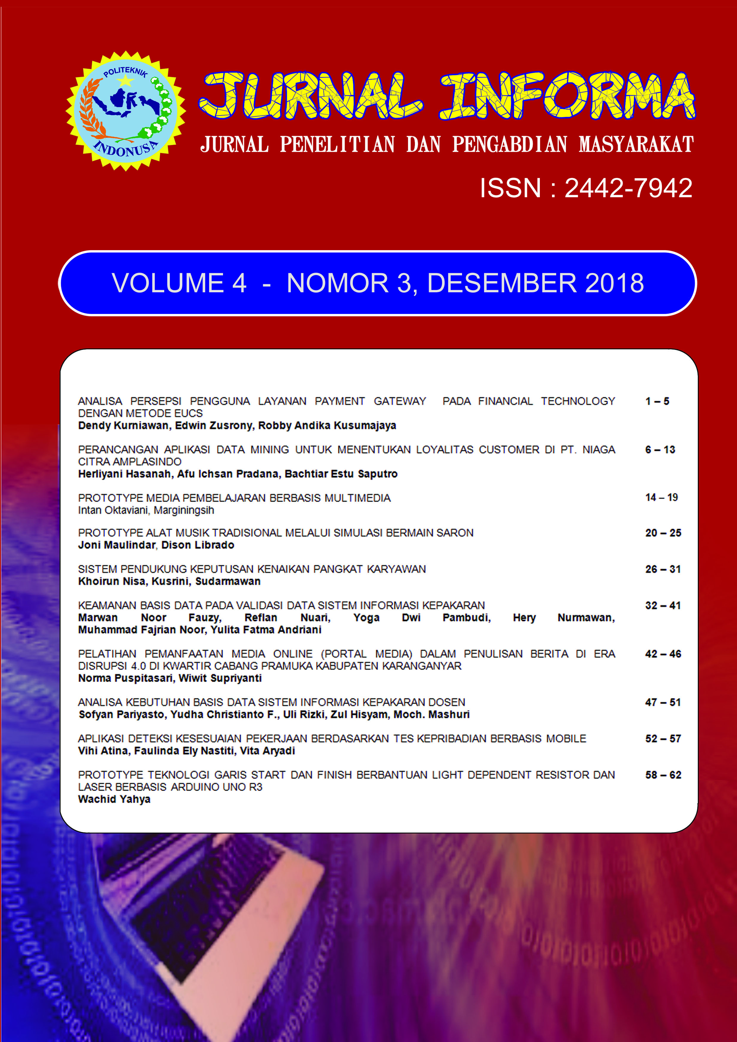 Dalam terbitan ini memuat 10 artikel hasil penelitian dan pengabdian masyarakat. Artikel pertama berjudul Analisa Persepsi Pengguna Layanan Payment Gateway Pada Financial Technology Dengan Metode EUCS ditulis oleh Dendy Kurniawan, Edwin Zusrony, dan Robby Andika Kusumajaya. Artikel kedua berjudul Perancangan Aplikasi Data Mining untuk Menentukan Loyalitas Customer di PT. Niaga Citra Mmplasindo ditulis oleh Herliyani Hasanah, Afu Ichsan Pradana, dan Bachtiar Estu Saputro. Artikel ketiga berjudul Prototype Media Pembelajaran Berbasis Multimedia ditulis oleh Intan Oktaviani dan Marginingsih. Artikel keempat berjudul Prototype Alat Musik Tradisional Melalui Simulasi Bermain Saron ditulis oleh Joni Maulindar dan Dison Librado. Artikel kelima berjudul Sistem Pendukung Keputusan Kenaikan Pangkat Karyawan ditulis oleh Khoirun Nisa, Kusrini, dan Sudarmawan. Artikel keenam berjudul Keamanan Basis Data Pada Validasi Data Sistem Informasi Kepakaran ditulis oleh Marwan Noor Fauzy, Reflan Nuari, Yoga Dwi Pambudi, Hery Nurmawan, Muhammad Fajrian Noor, dan Yulita Fatma Andriani. Artikel ketujuh berjudul Pelatihan Pemanfaatan Media Online (Portal Media) Dalam Penulisan Berita Di Era Disrupsi 4.0 Di Kwartir Cabang Pramuka Kabupaten Karanganyar ditulis oleh Norma Puspitasari dan Wiwit Supriyanti. Artikel kedelapan berjudul Analisa Kebutuhan Basis Data Sistem Informasi Kepakaran Dosen ditulis oleh Sofyan Pariyasto, Yudha Christianto F., Uli Rizki, Zul Hisyam, dan Moch. Mashuri. Artikel kesembilan berjudul Aplikasi Deteksi Kesesuaian Pekerjaan Berdasarkan Tes Kepribadian Berbasis Mobile ditulis oleh Vihi Atina, Faulinda Ely Nastiti, dan Vita Aryadi. Artikel terakhir berjudul Prototype Teknologi Garis Start Dan Finish Berbantuan Light Dependent Resistor Dan Laser Berbasis Arduino Uno R3 ditulis oleh Wachid Yahya.