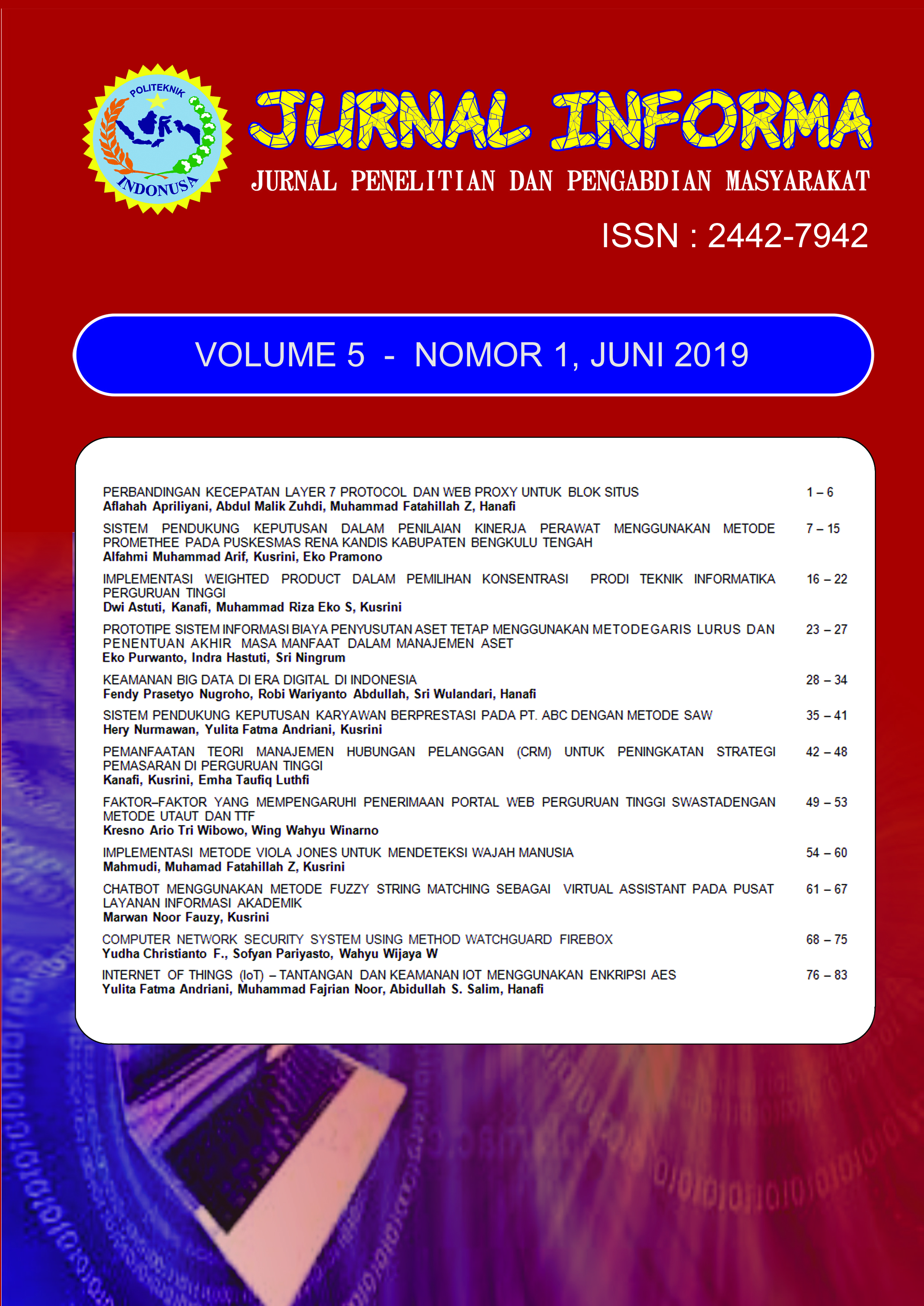Dalam terbitan ini memuat 12 artikel hasil penelitian dan pengabdian masyarakat. Artikel pertama berjudul Perbandingan Kecepatan Layer 7 Protocol Dan Web Proxy Untuk Blok Situs yang ditulis oleh Aflahah Apriliyani, Abdul Malik Zuhdi, Muhammad Fatahillah Z, dan Hanafi. Artikel kedua berjudul Sistem Pendukung Keputusan Dalam Penilaian Kinerja Perawat Menggunakan Metode Promethee Pada Puskesmas Rena Kandis Kabupaten Bengkulu Tengah yang ditulis oleh Alfahmi Muhammad Arif, Kusrini, dan Eko Pramono. Artikel ketiga berjudul Implementasi Weighted Product Dalam Pemilihan Konsentrasi Prodi Teknik Informatika Perguruan Tinggi yang ditulis oleh Dwi Astuti, Kanafi, Muhammad Riza Eko S, dan Kusrini. Artikel keempat berjudul Prototipe Sistem Informasi Biaya Penyusutan Aset Tetap Menggunakan Metodegaris Lurus Dan Penentuan Akhir Masa Manfaat Dalam Manajemen Aset yang ditulis oleh Eko Purwanto, Indra Hastuti, dan Sri Ningrum. Artikel kelima berjudul Keamanan Big Data Di Era Digital Di Indonesia yang ditulis oleh Fendy Prasetyo Nugroho, Robi Wariyanto Abdullah, Sri Wulandari, dan Hanafi. Artikel keenam berjudul Sistem Pendukung Keputusan Karyawan Berprestasi Pada PT. ABC Dengan Metode SAW yang ditulis oleh Hery Nurmawan, Yulita Fatma Andriani, dan Kusrini. Artikel ketujuh berjudul Pemanfaatan Teori Manajemen Hubungan Pelanggan (CRM) Untuk Peningkatan Strategi Pemasaran Di Perguruan Tinggi yang ditulis oleh Kanafi, Kusrini, Emha Taufiq Luthfi. Artikel kedelapan berjudul Faktor–Faktor Yang Mempengaruhi Penerimaan Portal Web Perguruan Tinggi Swastadengan Metode UTAUT Dan TTF yang ditulis oleh Kresno Ario Tri Wibowo, dan Wing Wahyu Winarno. Artikel kesembilan berjudul Implementasi Metode Viola Jones Untuk Mendeteksi Wajah Manusia yang ditulis oleh Mahmudi, Muhamad Fatahillah Z, dan Kusrini. Artikel kesepuluh berjudul Chatbot Menggunakan Metode Fuzzy String Matching Sebagai Virtual Assistant Pada Pusat Layanan Informasi Akademik yang ditulis oleh Marwan Noor Fauzy dan Kusrini. Artikel kesebelas berjudul Computer Network Security System Using Method Watchguard Firebox yang ditulis oleh Yudha Christianto F., Sofyan Pariyasto, dan Wahyu Wijaya W. Artikel terakhir berjudul Internet Of Things (IoT) – Tantangan Dan Keamanan IoT Menggunakan Enkripsi AES yang ditulis oleh Yulita Fatma Andriani, Muhammad Fajrian Noor, Abidullah S. Salim, dan Hanafi.