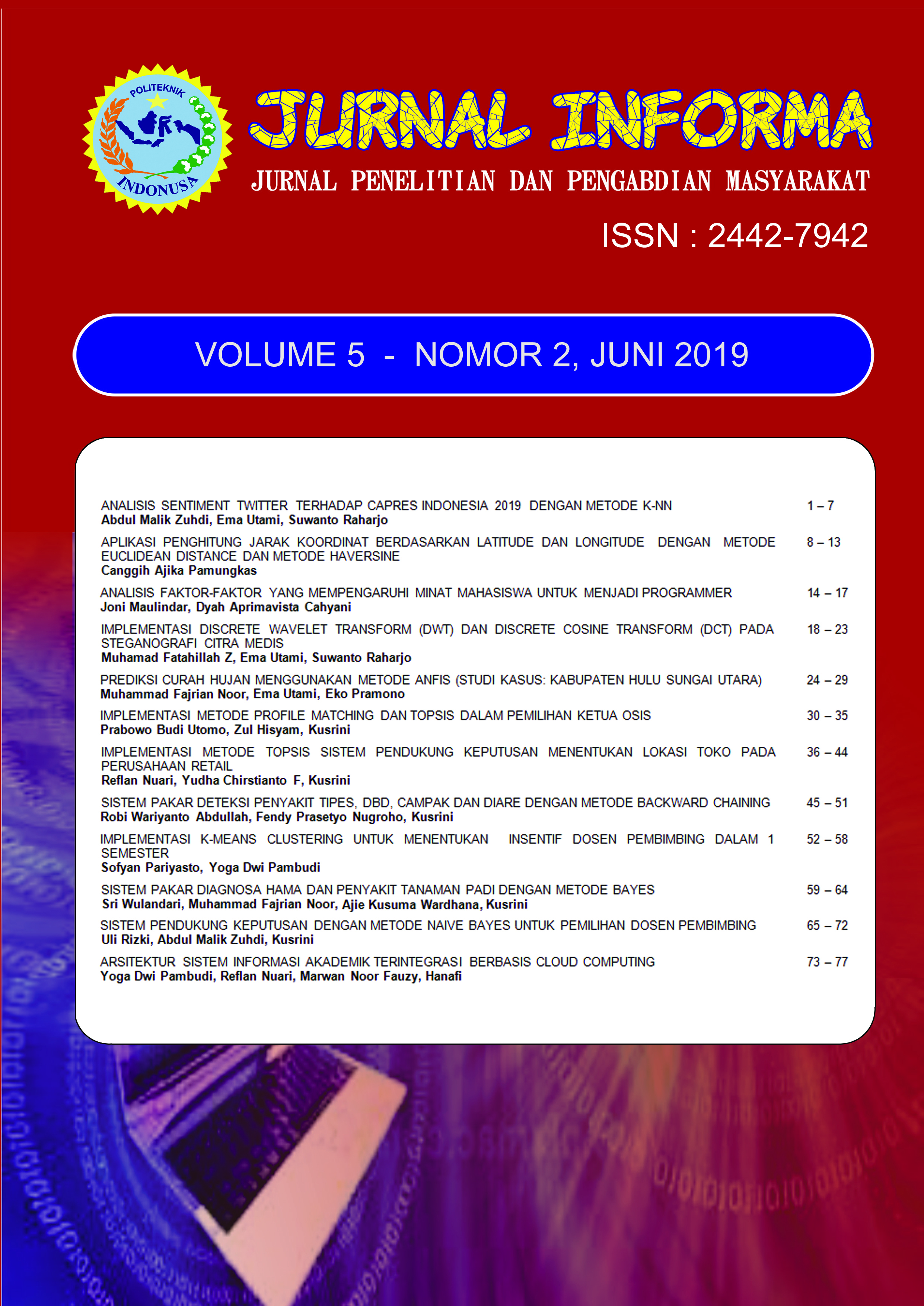 Dalam terbitan ini memuat 12 artikel hasil penelitian dan pengabdian masyarakat. Artikel pertama berjudul Analisis Sentiment Twitter Terhadap Capres Indonesia 2019 Dengan Metode K-NN yang ditulis oleh Abdul Malik Zuhdi, Ema Utami, dan Suwanto Raharjo. Artikel kedua berjudul Aplikasi Penghitung Jarak Koordinat Berdasarkan Latitude Dan Longitude Dengan Metode Euclidean Distance Dan Metode Haversine yang ditulis oleh Canggih Ajika Pamungkas. Artikel ketiga berjudul Analisis Faktor-Faktor Yang Mempengaruhi Minat Mahasiswa Untuk Menjadi Programmer yang ditulis oleh Joni Maulindar dan Dyah Aprimavista Cahyani. Artikel keempat berjudul Implementasi Discrete Wavelet Transform (Dwt) Dan Discrete Cosine Transform (DCT) Pada Steganografi Citra Medis yang ditulis oleh Muhamad Fatahillah Z, Ema Utami, dan Suwanto Raharjo. Artikel kelima berjudul Prediksi Curah Hujan Menggunakan Metode Anfis (Studi Kasus: Kabupaten Hulu Sungai Utara) yang ditulis oleh Muhammad Fajrian Noor, Ema Utami, dan Eko Pramono. Artikel keenam berjudul Implementasi Metode Profile Matching Dan Topsis Dalam Pemilihan Ketua OSIS yang ditulis oleh Prabowo Budi Utomo, Zul Hisyam, dan Kusrini. Artikel ketujuh berjudul Implementasi Metode Topsis Sistem Pendukung Keputusan Menentukan Lokasi Toko Pada Perusahaan Retail yang ditulis oleh Reflan Nuari, Yudha Chirstianto F, dan Kusrini. Artikel kedelapan berjudul Sistem Pakar Deteksi Penyakit Tipes, DBD, Campak Dan Diare Dengan Metode Backward Chaining yang ditulis oleh Robi Wariyanto Abdullah, Fendy Prasetyo Nugroho, dan Kusrini. Artikel kesembilan berjudul Implementasi K-Means Clustering Untuk Menentukan Insentif Dosen Pembimbing Dalam 1 Semester yang ditulis oleh Sofyan Pariyasto dan Yoga Dwi Pambudi. Artikel kesepuluh berjudul Sistem Pakar Diagnosa Hama Dan Penyakit Tanaman Padi Dengan Metode Bayes yang ditulis oleh Sri Wulandari, Muhammad Fajrian Noor, Ajie Kusuma Wardhana dan Kusrini. Artikel kesebelas berjudul Sistem Pendukung Keputusan Dengan Metode Naive Bayes Untuk Pemilihan Dosen Pembimbing yang ditulis oleh Uli Rizki, Abdul Malik Zuhdi, dan Kusrini. Artikel terakhir berjudul Arsitektur Sistem Informasi Akademik Terintegrasi Berbasis Cloud Computing yang ditulis oleh Yoga Dwi Pambudi, Reflan Nuari, Marwan Noor Fauzy dan Hanafi.