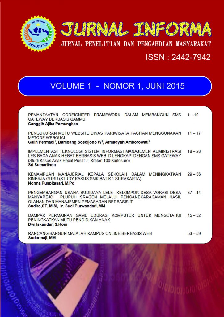 Jurnal INFORMA merupakan jurnal ilmiah bidang ilmu Komputer dan Informatika bersifat terbuka yang memuat tulisan hasil penelitian dan pengabdian kepada masyarakat. Jurnal ini diterbitkan oleh Program Studi D3 Sistem Informasi Politeknik Indonusa Surakarta. Jurnal terbit 2 kali dalam setahun, yakni pada bulan Juni dan Desember. Dalam terbitan ini memuat 5 artikel hasil penelitian.